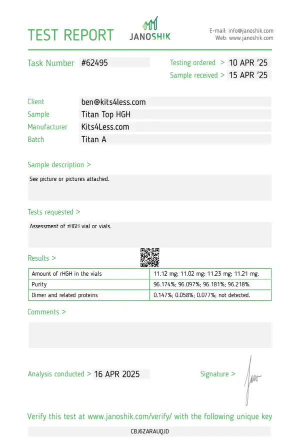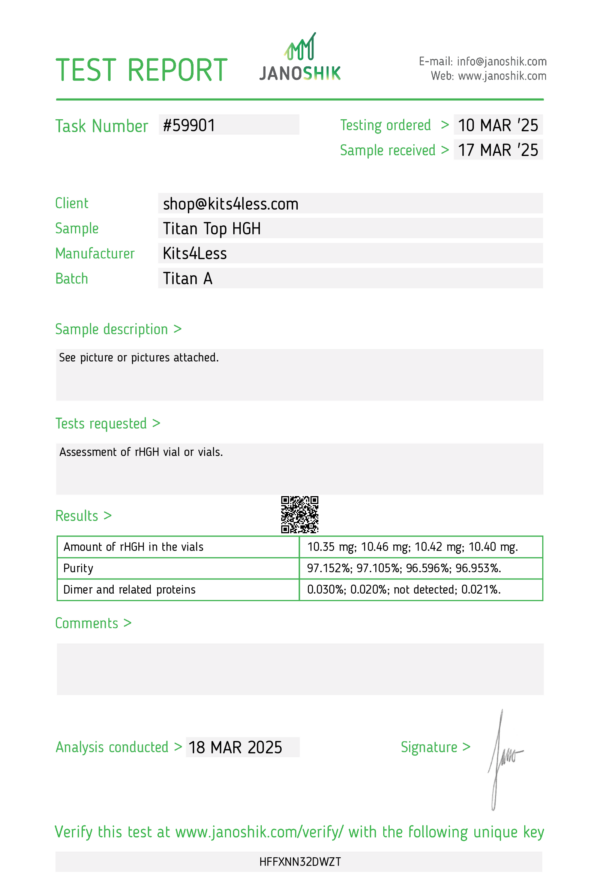 Titan HGH is the crown jewel of our peptide line — a highly anticipated release engineered for maximum purity, potency, and performance. Each kit delivers 10 vials of avg 38.5 IU pharmaceutical-grade recombinant Human Growth Hormone (rHGH), trusted by athletes, bodybuilders, and optimization enthusiasts for its unmatched results in muscle growth, fat loss, recovery, and overall vitality.